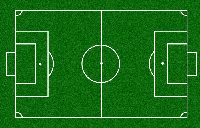 Las medidas principales son: un rectángulo de mínimo 50 m. y máximo 60 m. por mínimo 30 m. y máximo 45 m; porterías de 6 m. por 2 m; área chica de 12 m. por 4.5 m; área grande de 24 m. por 11 m; tiro penal a 9 m.